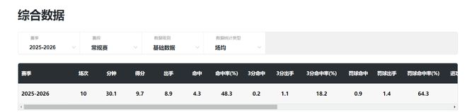 第一场比赛21分钟,11中6,三分1中0,拿到15分7篮板2助攻,命中率54.5%;